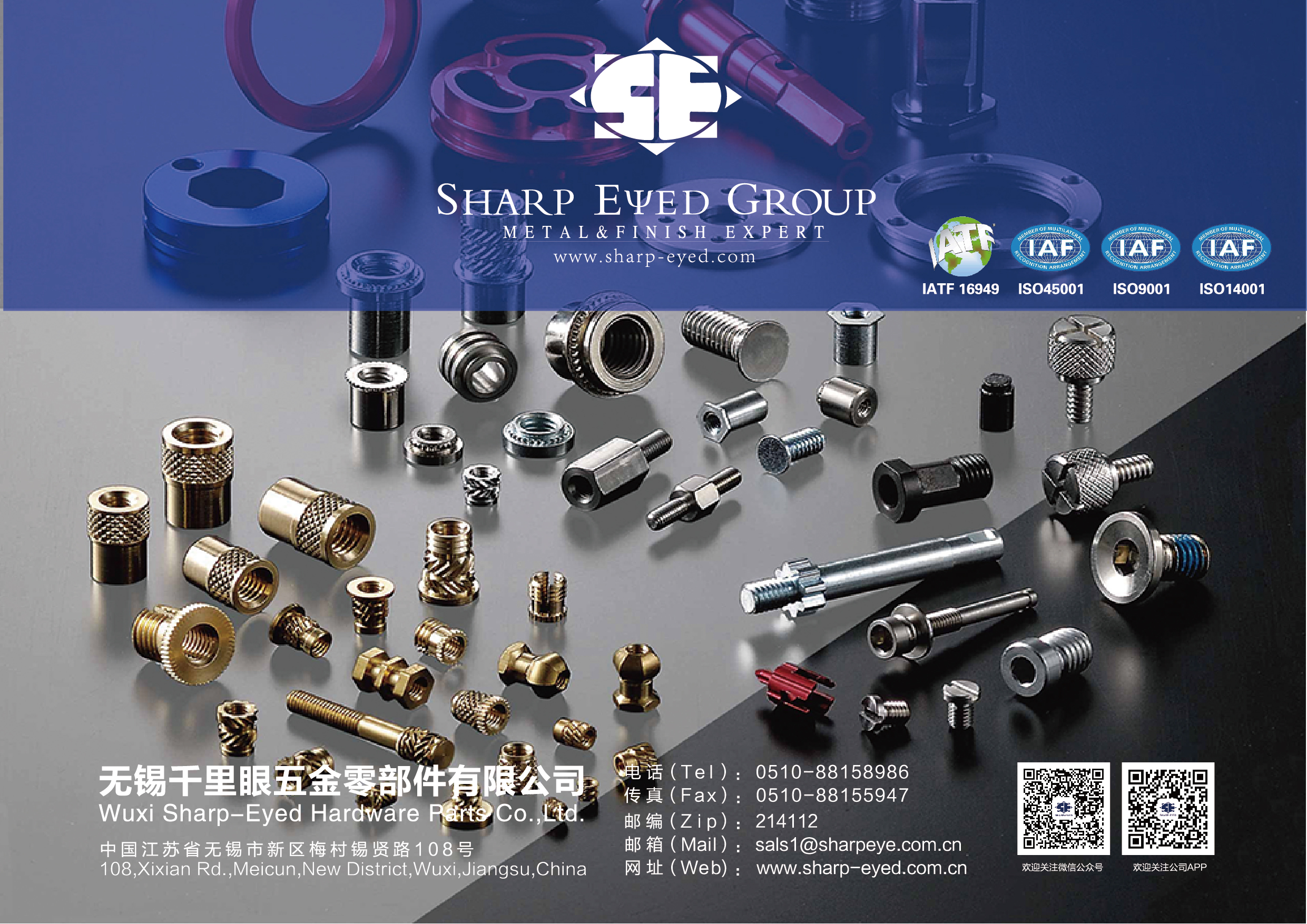 | 無錫千里眼五金零部件有限公司位於江蘇省無錫市高新區,於2004年1月成立,總部位於台灣台中。無錫千里眼以專業研發、制造和銷售精密五金零部件為主。擁有自動車床、CNC數控車銑復合式車床、CNC立式加工中心、CNC精雕機、螺絲機、銑邊機、彈簧機等設備,產品有塑膠植入螺帽、鐵板鉚接件、激光焊接件、微型軸芯、精密螺絲、光學接頭、通訊設備零件、機械零件、汽車零件等。服務行業遍及各種領域,例如手機、IT行業、數位相機、汽車工業、醫療設備、電動工具、航空科技、精密儀器、智能夾具設計、智能手表等。 於2005年通過ISO9001國際質量管理體系認證及ISO14001環境管理體系認證,更於2013年獲得IATF16949汽車工業認證,2020年獲得ISO45001職業健康安全管理體系認證,2022年通過高新技術企業認證,2024年通过专精特新企业认证以提供客戶更好的品質保障。